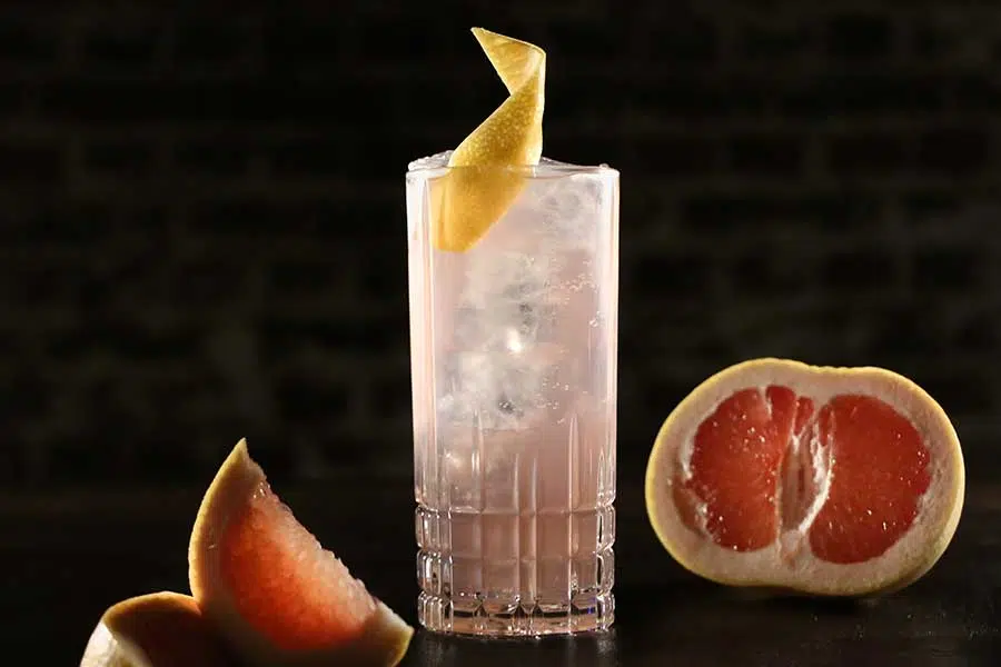 - Alle Zutaten außer Tonic mit Eiswürfeln shaken und in ein Longdrinkglas auf Eiswürfel abseihen. Mit Tonic auffüllen und kurz verrühren. Mit einem Stück Zitrone oder einer Grapefruitzeste garnieren.