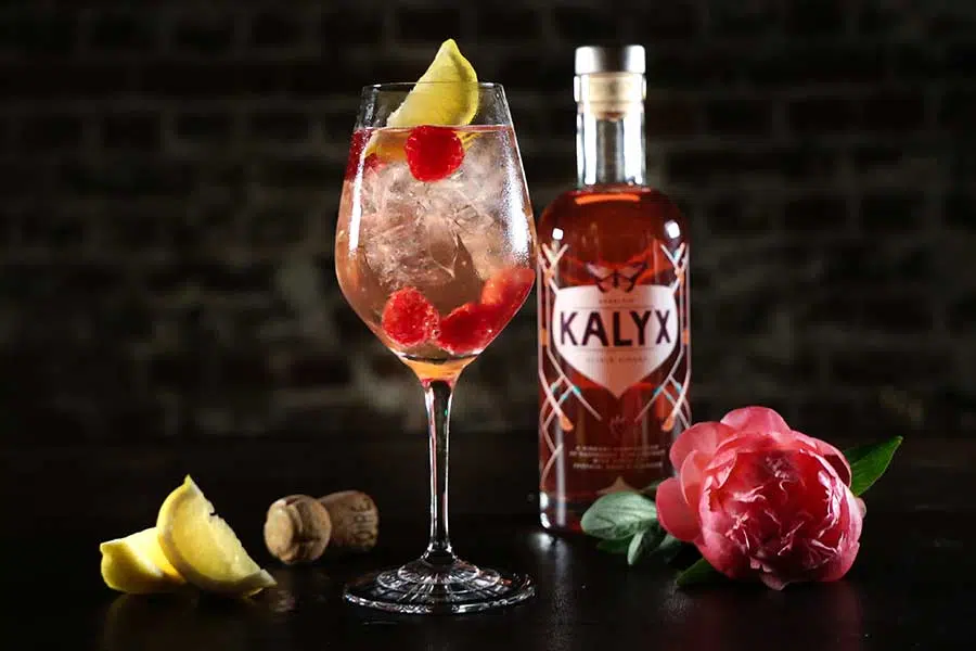- Kalyx mit Eiswürfeln in ein Weinglas geben und mit Schaumwein auffüllen. Mit einem Stück Zitrone und Himbeeren garnieren.